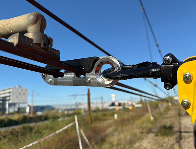 Accessoire de tirage permettant de maintenir la tension radiale du fil de contact caténaire sur réseau 1500 V / 25000 V.